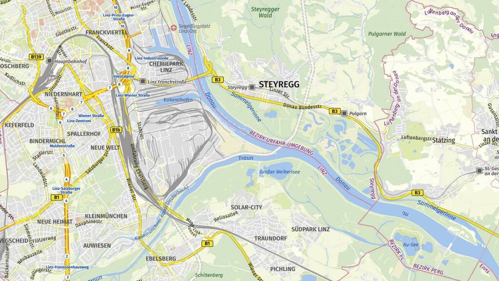 Die unmittelbare Nähe zu A1 und B1 bietet eine ideale Anbindung an das österreichische Autobahnnetz. Die südliche Zufahrt über die Graf-Zeppelin-Straße ist rund um die Uhr befahrbar, ohne Wohngebiete zu passieren. Nur wenige Fahrminuten entfernt finden sich sämtliche Einkaufsmöglichkeiten für den täglichen Bedarf.