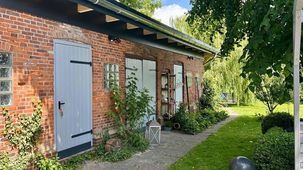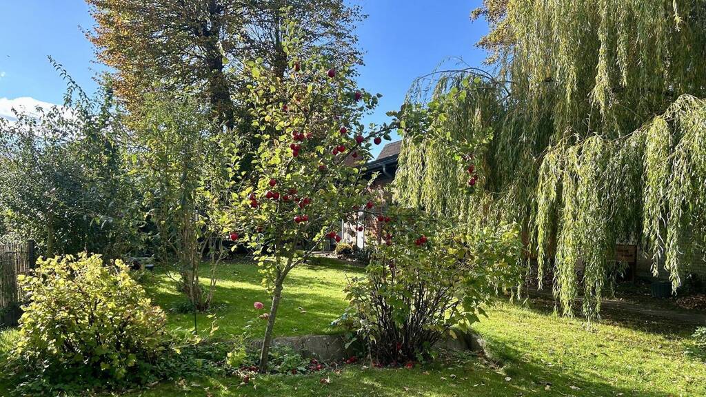 Das ca. 732 m² große Grundstück bietet eine liebevoll angelegte Gartenidylle mit sonniger Terrasse. Besonders hervorzuheben ist der große, historisch gemauerte Schuppen mit neuem Dach, in dem sich Heizungsanlage und Haustechnik befinden - funktional und vielseitig nutzbar.