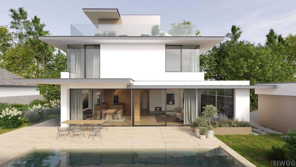 EG: große Wohnküche mit Bibliothek, Terrasse/Garten/Pool OG. 1: 4 Zimmer und 2 Bäder DG: Dachterrasse UG: Gästezimmer (zusätzlicher separater Eingang durch Garten), Badezimmer, Fitness-/Saunaraum, Technikraum, Lager Nebengebäude: Garage mit Platz für 2 KFZ Gesamtfläche lt. Planung (inkl. UG): ca. 286 m2