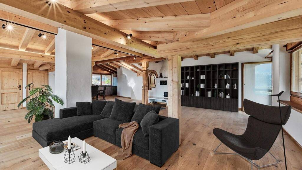 Die einladende Treppe führt Sie in das Dachgeschoss, wo Sie ein weitläufiger und offener Wohnbereich mit einem beeindruckenden Sichtdachstuhl erwartet. An kalten Tagen sorgt der stilvolle Kachelofen in Kombination mit dem hochwertigen Dielenboden für ein behagliches und warmes Wohngefühl. Die moderne und erstklassige Küche erfüllt all Ihre kulinarischen Träume, während sich in der Speisekammer ausreichend Platz für diverse Spezialitäten findet. Das Gäste-WC und der Waschraum befinden sich ebenfalls auf dieser Ebene. Des Weiteren befindet sich in diesem Geschoss das Masterschlafzimmer mit einem beeindruckenden Ankleidebereich und einem hochwertigen Masterbadezimmer.