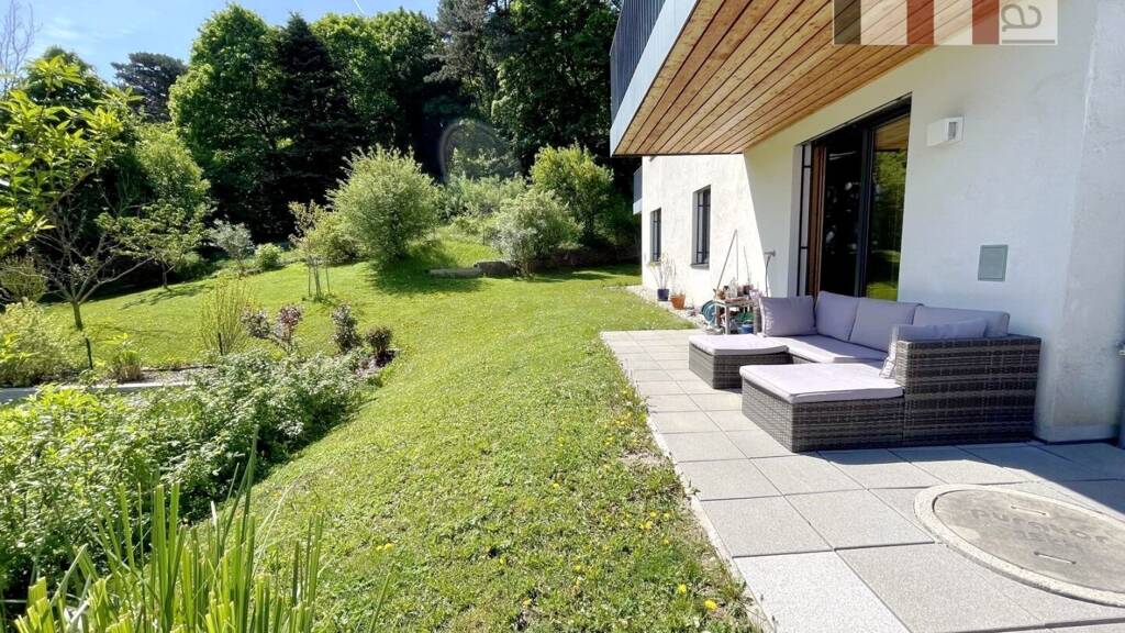 Die luxuröse Wohnung selbst ist barrierefrei, auch über die Garage gut zu erreichen und hochwertig bestens ausgestattet. Die geräumigen 4 Zimmer sind zentral begehbar; eine voll ausgestattete Vollholz-Tischler-Küche mit Miele-Geräten ist sehr charmant und wurde durch das Enfernen einer Zwischenwand an das großzügige Wohnzimmer angepasst bzw. vergrößert. Das somit rund 45,38m² große Wohnzimmer inkl. offener Küche ist aufgrund der Vielzahl an Fensterflächen und diversen Ausgänge auf die 66,08m2 große Terrasse und in den ca.526,64m2 großen eigenen Prachtgarten mit tollem Fern- und Grünblick mehr als einladend. Die beiden Schlafzimmer und der Arbeitsraum (Büro) sind vernünftig dimensioniert und mit abgestimmten Einbaumöbeln passend ausgestattet. Diese 3 Zimmer haben selbstverständlich auch einen direkten Ausgang in den Garten bzw. Terrasse und somit einen ruhigen Grün- und Waldblick. Komplettiert wird das Raumangebot mit zwei Badezimmern, jeweils mit Toilette, Badewanne. bzw. Dusche. Eine Gästetoilette ist zusätzlich und selbstverständlich. Weiters vom Vorraum begehbar besteht ein Abstellraum und ein großzügiger eigener Schrankraum zum Schlafzimmer. Ein eigener großer Lagerraum im Keller von mehr als 20,59m² mit Licht- und Stromanschluss steht ebenfalls zur Verfügung. Ein Tiefgaragenplatz mit Fernbedienung ist im Kaufpreis inkludiert.