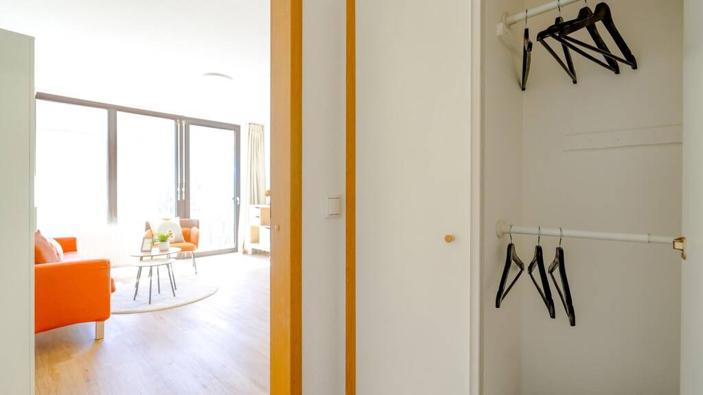Das helle Wohnzimmer vereint Wohnen, Schlafen, Essen und Arbeiten in einem harmonischen Raum. Ein bequemes Bett sowie ein geräumiger Schrank bieten ausreichend Stauraum für Kleidung und persönliche Gegenstände. Ein Esstisch mit Stühlen lädt zum gemeinsamen Essen oder Arbeiten ein. Für entspannte Abende steht ein moderner Fernseher bereit.