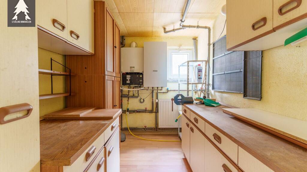 Beheizt wird über eine Gastherme, die in der Werkstatt im Erdgeschoss untergebracht ist. Der Stromanschluss ist aktuell nicht vorhanden, lässt sich jedoch - wie bei den umliegenden Häusern - herstellen. Kunststofffenster mit Doppelverglasung wurden bereits verbaut. Ein einfacher Schuppen auf dem Grundstück dient als Abstellfläche für Gartengeräte oder Ähnliches.