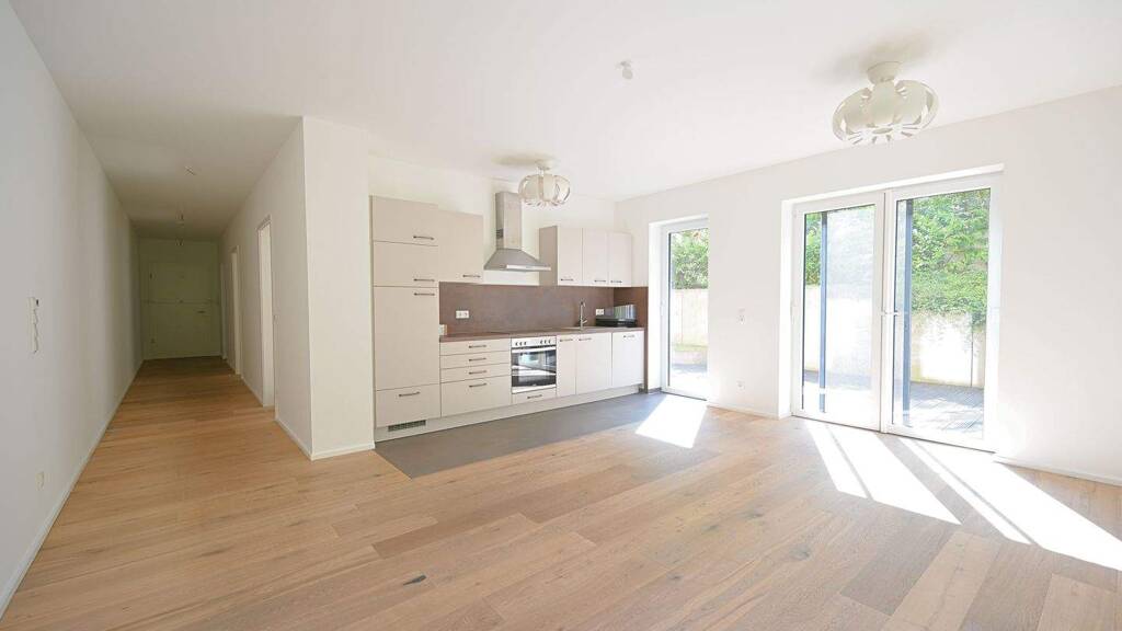 Beim Betreten der Wohnung führt Sie ein geräumiger Flur direkt in den offenen, lichtdurchfluteten Wohnbereich. Zur linken Seite befinden sich die beiden ruhig gelegenen Schlafzimmer sowie ein modernes Bad. Hochwertiges Eichenparkett zieht sich durch alle Wohnräume und sorgt für eine warme, stilvolle Atmosphäre. Der offen gestaltete Wohn- und Essbereich überzeugt mit einer eleganten Einbauküche, während die bodentiefe Fensterfront den Raum optisch erweitert und nahtlos auf die eigene Terrasse überleitet - ein Ort mit ganz besonderem Flair, der zum Verweilen, Genießen und Ankommen einlädt.