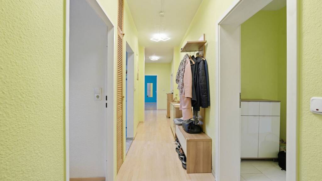 Die Aufteilung umfasst vier Zimmer sowie zwei Badezimmer - eines mit Dusche, das andere mit Dusche und Badewanne. Damit eignet sich die Wohnung gut für Haushalte mit höherem Platzbedarf oder unterschiedlichen Nutzungsansprüchen.