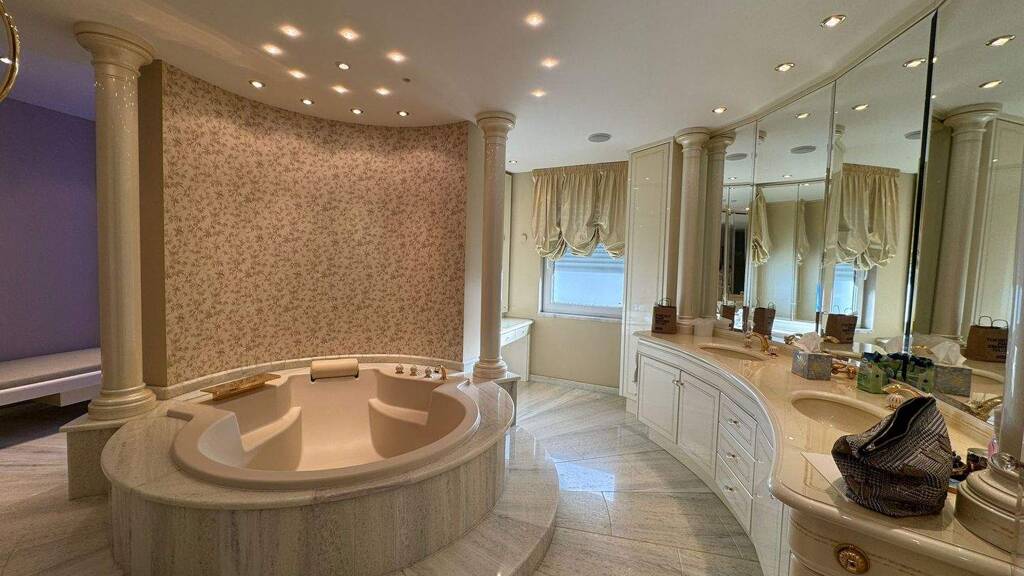 Die Wohnung verfügt über zwei Schlafzimmer und ein Ankleidezimmer. Zwei elegante Bäder, darunter ein Luxusbad mit Whirlpool und Sauna, sorgen für höchsten Komfort. Zusätzlich steht ein Gäste-WC zur Verfügung.
