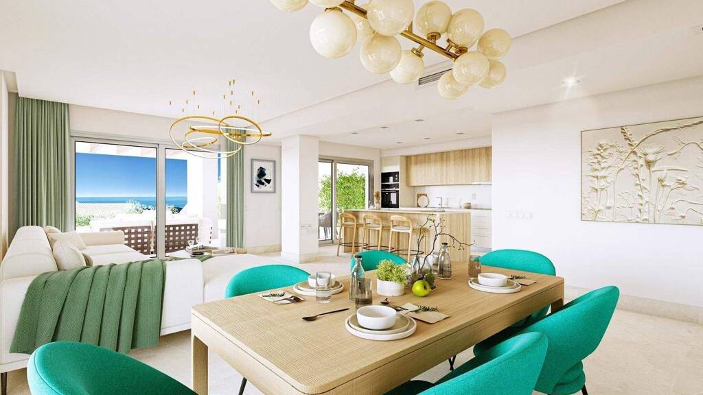 Dieses zeitgenössische Erdgeschoss-Apartment mit 2 Schlafzimmern und 2 Badezimmern befindet sich in einer neu erbauten Wohnanlage in den erhobenen Hügeln der New Golden Mile, einer Gegend, die für Ruhe, offene Landschaften und Nähe zur Küste bekannt ist. Genießen Sie einenpanoramablick über das Mittelmeer und die umliegenden Golfplätze; die Immobilie verbindet modernes Design mit einem starken Fokus auf Outdoor-Living und alltäglichen Komfort. Die Innenraumaufteilung konzentriert sich auf einen offenen Wohn- und Essbereich, der nahtlos mit der Küche verbunden ist und Raum für helles, funktionales Wohnen und Unterhaltung bietet. Große Formate-Fenster verlaufen entlang der Hauptfassade und lassen natürliches Licht in die Wohnung fluten, während sie den offenen Blick rahmen. Vom Wohnbereich führt der direkte Zugang zu einer großzügigen privaten Terrasse, die eine gedeckte Zone für Outdoor-Dining, Entspannung oder geselliges Beisammensein das ganze Jahr über umfasst. Diese Terrasse wirkt als natürliche Erweiterung des Innenraums und verstärkt das Raumgefühl sowie die Verbindung zur Umgebung. Die Küche besticht durch modernes Design mit einer zentralen Insel und ist mit hochwertigen Siemens-Geräten voll ausgestattet, wodurch klare Linien auf Funktionalität treffen. Eine unabhängige Waschküche liegt angrenzend an die Küche, damit Servicetätigkeiten unauffällig vom Hauptwohnraum getrennt bleiben. Die Gesamtaufteilung priorisiert fließende Bewegungsabläufe und eine klare Trennung zwischen Wohnen und Ruhen. Beide Schlafzimmer sind geräumig und mit Einbauschränken ausgestattet. Das Hauptschlafzimmer verfügt über ein en-suite Badezimmer und direkten Zugang zur Terrasse, was eine private und komfortable Rückzugsmöglichkeit mit Blick nach draußen bietet. Das zweite Schlafzimmer ist ebenso gut proportioniert und wird von einem zweiten Vollbad bedient, wodurch die Wohnung ideal für Paare, Gäste oder eine hochwertige Zweitresidenz ist. Die Immobilie ist mit Klimaanlage und Fußbodenheizung ausgestattet, was ganzjährigen Komfort gewährleistet. Zu den zusätzlichen Merkmalen zählen ein privater Abstellraum und ein Tiefgaragenstellplatz, beide bequem über den Aufzug von den Wohnebenen aus erreichbar. Bewohner der Entwicklung genießen eine sorgfältig gestaltete Gemeinschaftsumgebung mit einem großen Salzwasser-Schwimmbecken, einem separaten Kinderbecken, gepflegten Gärten und dedizierten Sanitäranlagen mit Duschen. Die Gemeinschaft ist darauf ausgelegt, einen entspannten Lebensstil zu bieten, während Privatsphäre und Sicherheit gewahrt bleiben. Gelegen in einer prestigeträchtigen und ruhigen Enklave der New Golden Mile profitiert das Apartment von schnellem Zugang zu Stränden, Golfplätzen und einem umfassenden Angebot an Annehmlichkeiten. Das Stadtzentrum von Estepona und Puerto Banús sind in ca. fünfzehn Autominuten erreichbar, was eine hervorragende Balance zwischen Abgeschiedenheit und Anbindung bietet. Diese Immobilie stellt eine attraktive Gelegenheit dar, modernes Wohnen mit Panoramablick, großzügigem Outdoor-Bereich und hochwertigen Ausstattungen in einer der gefragtesten aufstrebenden Lagen der Costa del Sol zu genießen. Für weitere Informationen oder um eine Besichtigung zu vereinbaren.