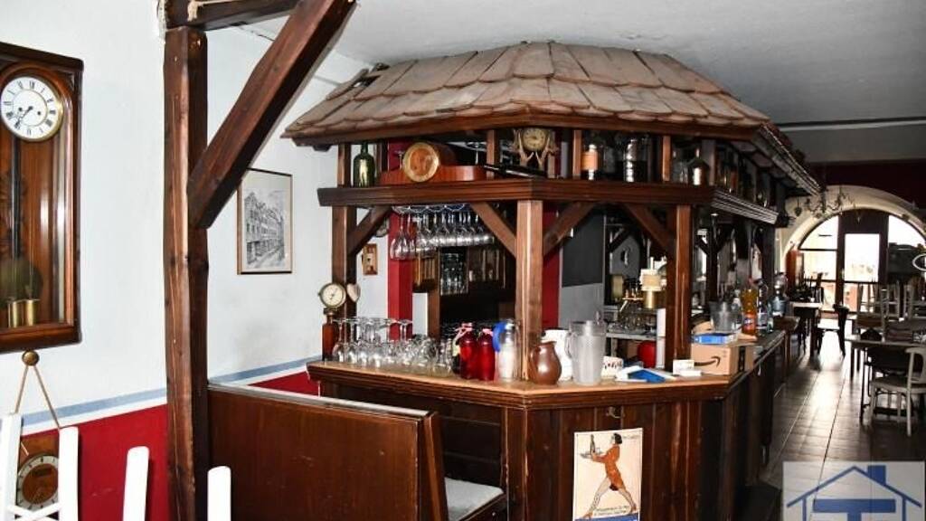 Im EG sind die Küche, 2 Toiletten, Lagerraum und die rustikal gestaltete Theke sowie der Gastraum mit 11 Tischen für ca. 45 Gäste, im Zwischengeschoss oberhalb, findet sich noch ein Tonnengewölbe mit weiteren 5 Tischen und 25 Plätzen. Im Biergarten können weitere geschätzte 25 Personen bewirtet werden.