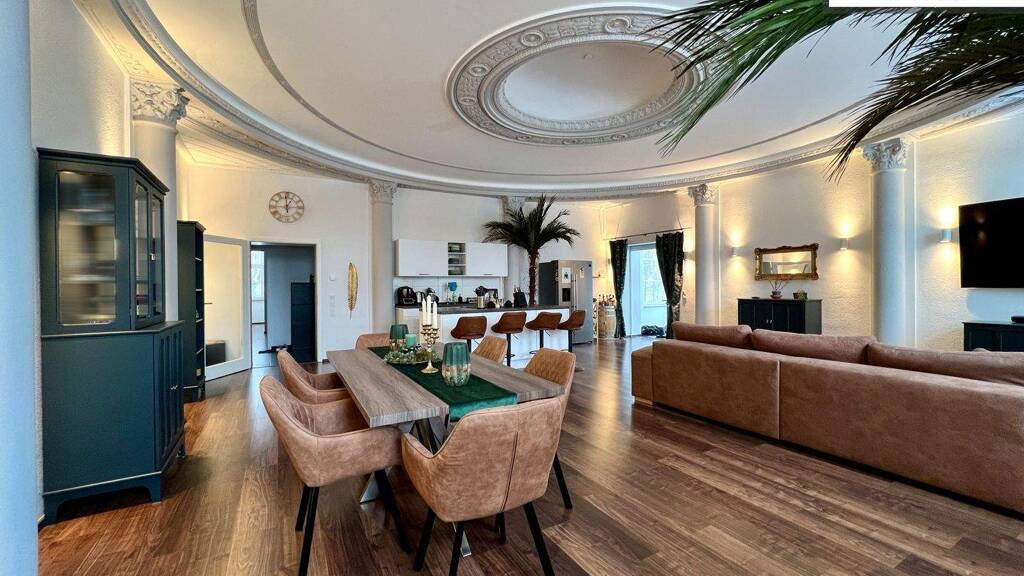 Das Herzstück der Wohnung ist der imposante Wohn- und Essbereich. Dieser beeindruckt mit einer schönen Stuckdecke, eleganten Säulenelementen und einem durchdachten Lichtkonzept, das eine einladende Atmosphäre schafft. Ein besonderer Blickfang ist der elegante Erker mit großen Fenstern, der viel Tageslicht hereinlässt und den Raum optisch erweitert. Die offene Küche lädt zum gemeinsamen Kochen ein.