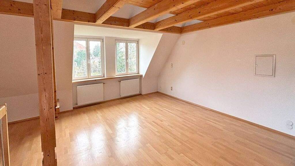 Besonders hervorzuheben ist das lichtdurchflutete Dachzimmer mit über 33 m², erreichbar über die innenliegende Holz-Wendeltreppe.