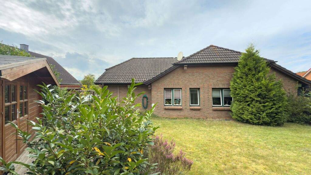 Dieser gepflegte Bungalow aus dem Jahr 1995, mit einer Wohnfläche von ca. 136 m², befindet sich in ruhiger Lage in einer Sackgasse. Eine großzügige gepflasterte Auffahrt führt zur Garage und zum Eingang des Hauses. Das ca. 757 m² große Grundstück ist liebevoll angelegt und bietet durch die gewachsene Bepflanzung ein hohes Maß an Privatsphäre.