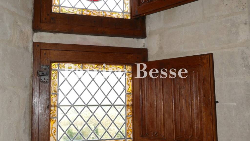 The landing with oakwood stripped flooring leads to four bedrooms. The bathroom and shower room both boast travertine stone flooring identical to the ground floor. At the end of the corridor, a door opens into the enclosed gangway into the tower.The entrance towerThis square tower was built in the 15th century on 13th-century foundations. At the bottom, a lancet arch vaulted passage runs through it from east to west. It has a gentle sloped pavilion roof, under which the walls of the third storey are partially covered by a shingle made up of wooden tiles. At its northwest corner, it is flanked by a 17th-century hexagonal tower containing a spiral staircase which can be reached from the courtyard through a rectangular door surmounted by a semi-circular tympanum featuring three weathered coats of arms. The tower's pointed roof is made of flat tiles.