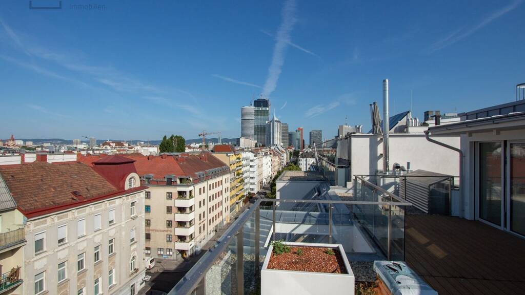 Dieses exklusive Dachgeschoss-Penthouse erreichen Sie mit einem eigenen Lift. Es gliedert sich in große Wohnküche (ca. 59,47 m²), Master-Bedroom mit en-Suite-Bad mit Badewanne, Dusche und WC sowie Terrassenzugang, ein weiteres Schlafzimmer mit Terrassenzugang, zwei Schlafzimmer, welche sich ein Duschbad mit WC teilen und ein Gäste-WC. Ein Stiegenaufgang führt ins Galeriegeschoss, wo sich der Zugang zur Dachterrasse mit Pool befindet von der Sie einen traumhaften Rundumblick über die alte Donau bis in die Stadt genießen.