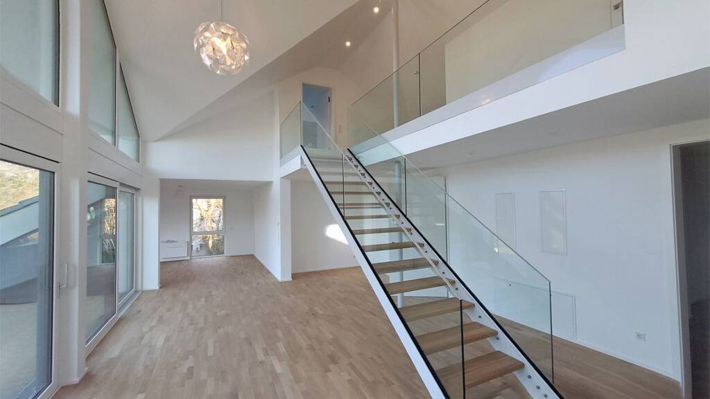 Die stilvolle Treppe mit Glasgeländer ist ein Highlight dieser Wohnung; von hier aus gelangen Sie in die obere Wohnebene, die den privaten Rückzugsort der Wohnung bildet.