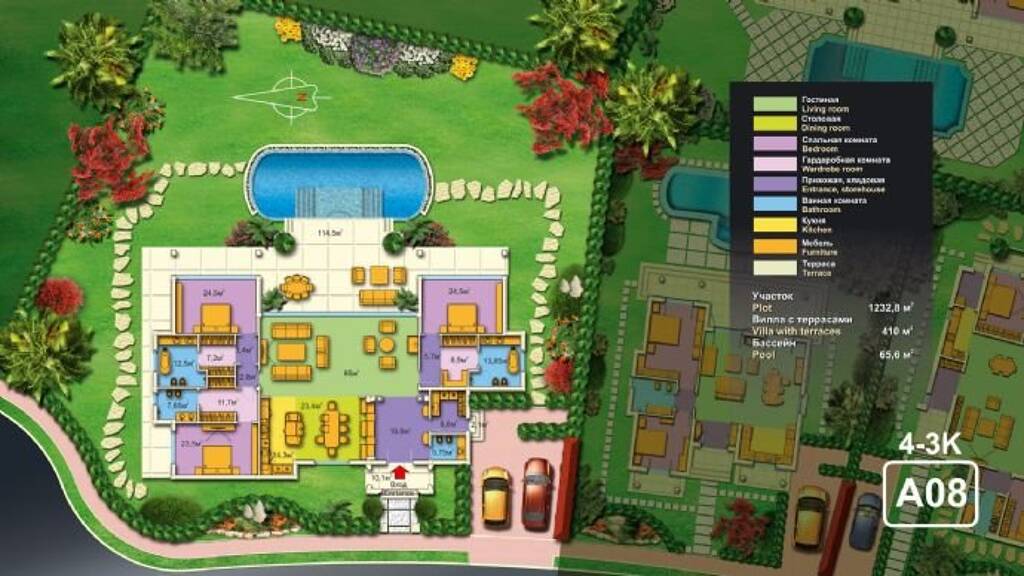 Die Gesamtfläche der Villa beträgt 450 qm, sie ist auf eigener Parzelle von 1300 qm gelegen und hat ein Schwimmbecken mit einer Größe von 66 qm.