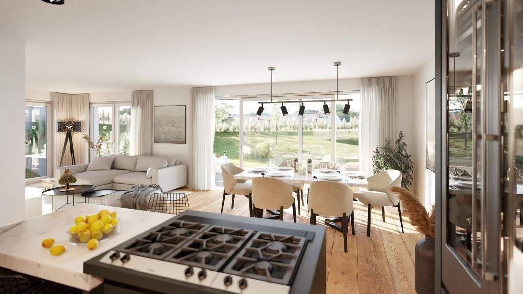 Im Zentrum des Hauses steht der großzügige Wohn- und Essbereich mit offener Küche, der durch bodentiefe Fenster mit Licht durchflutet wird und direkten Zugang zur Terrasse bietet. Ein praktischer Speiseraum, direkt an die Küche angeschlossen, schafft zusätzlichen Komfort im Alltag.