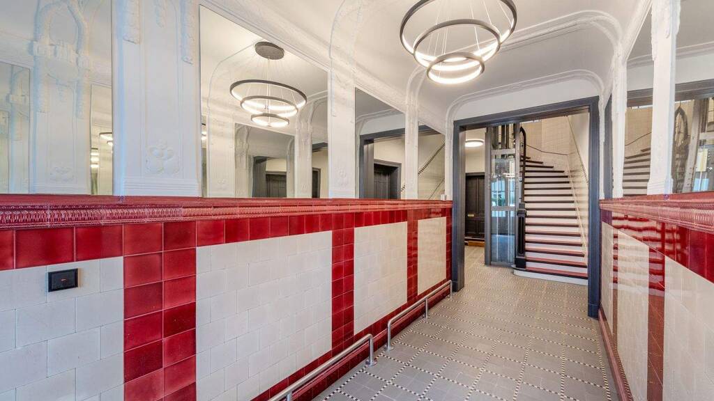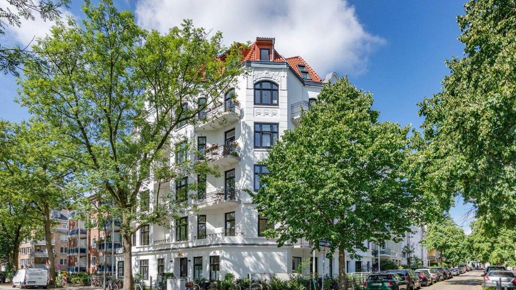 Das wunderschöne Jugendstilgebäude mit detaillierten Fassadenstuckelementen wurde um 1909 mit 5 Geschossen errichtet und ca. 2006 um drei großzügige Dachgeschosswohnungen erweitert. In den Jahren von ca. 2020-2022 wurde das Gebäude aufwendig modernisiert und renoviert. Die Maßnahmen umfassten unter anderem den Einbau von neuen isolierverglasten dunklen Holzfenstern, die einen spannenden Kontrast zu der strahlend weißen Fassade bieten. Das Treppenhaus wurde ebenso renoviert und besticht mit einer Mischung aus den typischen Altbauelementen - z.B. aufgearbeitete originale Wohnungseingangstüren, originale Fliesen, Stuck- & Zierelemente - sowie einem maßgeschneiderten gläsernen Aufzug, der bis in das Dachgeschoss führt.