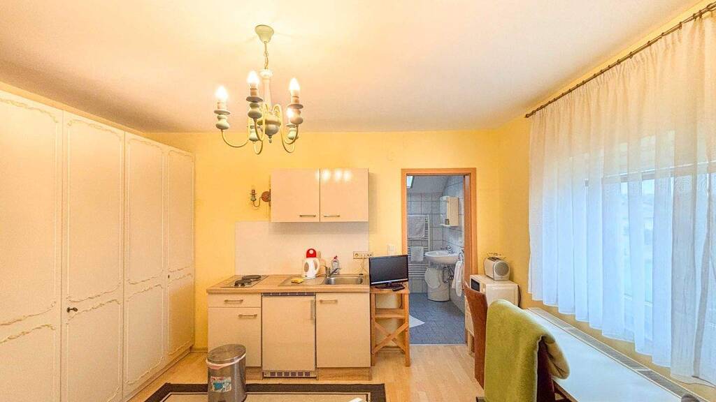 Der kombinierte Wohn-, Ess- und Schlafbereich ist mit einer kleinen Teeküche ausgestattet. Im angrenzenden Badezimmer befindet sich eine Dusche. Die Wohnung wird vollständig möbliert übergeben, sodass ein sofortiger, unkomplizierter Einzug möglich ist. Alle vorhandenen Möbel verbleiben in der Wohnung. Eine Waschmaschine befindet sich im Keller und kann vom Mieter genutzt werden.
