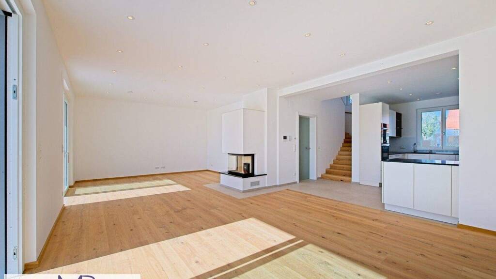 Das Herzstück des Hauses bildet dabei der 2,80m hohe, helle und offen gestaltete Wohn- und Essbereich mit rund 41 m² , sowie ein stilvoller offener Kamin. Der angrenzende, etwa 17 m² große Küchenbereich, fügt sich mit seinen Maßmöbeln harmonisch in das Raumkonzept ein und schafft ausreichend Platz für eine mehrköpfige Familie. Eine davor liegende, weitläufige, ca. 81m² große Terrasse umschließt zudem das ganze Haus und bietet wie der große Garten genug Platz für entspannende Stunden im Freien.