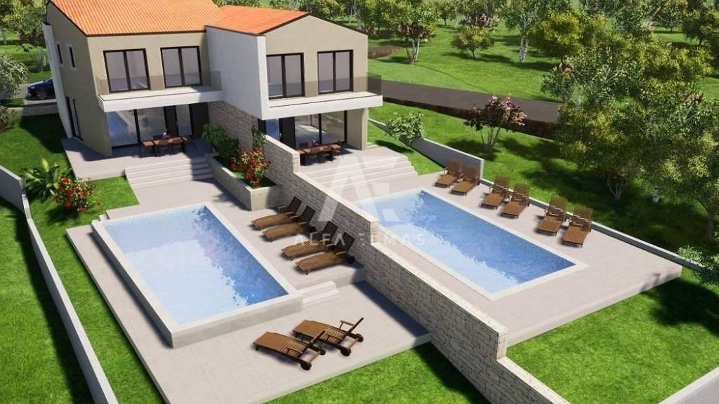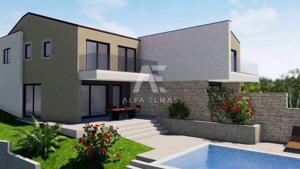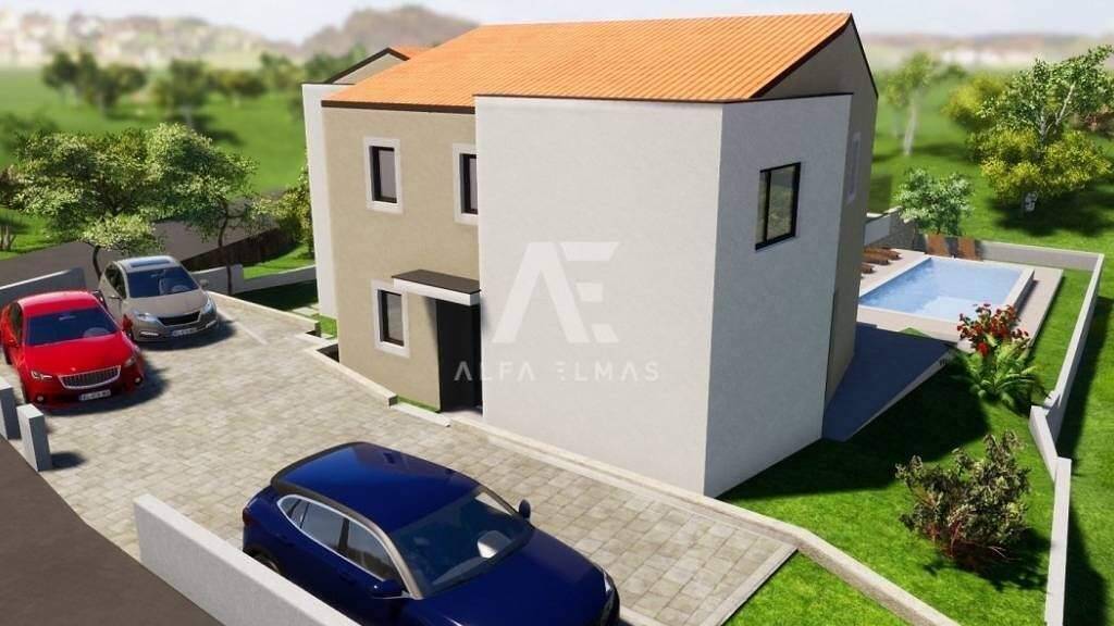 Malinska, neu gebautes, prächtiges Doppelhaus mit Swimmingpool in ruhiger Lage, nur 2000 m vom Meer und den dazugehörigen Annehmlichkeiten entfernt!! Die Doppelhaushälfte besteht aus einem Erdgeschoss und einem Obergeschoss, eine harmonische Kombination aus zeitlosem und modernem Design mit einer Gesamtwohnfläche von 145 m2.
