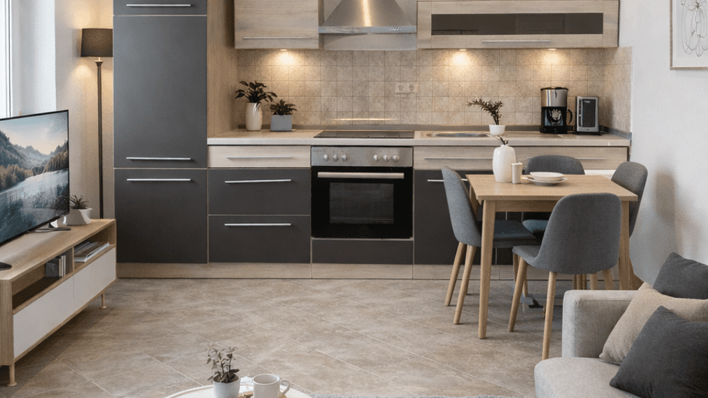 Der offen gestaltete Wohn-, Schlaf- und Essbereich bietet vielseitige Einrichtungsmöglichkeiten und schafft ein angenehmes Raumgefühl. Der Küchenbereich ist sinnvoll integriert und ermöglicht eine klare Struktur innerhalb des Wohnraums.