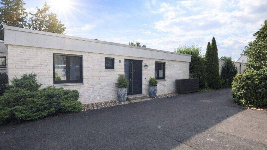 Der Bungalow verfügt über vier Zimmer, die flexibel als Schlafzimmer, Büro oder Gästezimmer genutzt werden können. Ein Badezimmer mit Badewanne und Dusche sowie ein Gäste-WC sorgen für zusätzlichen Komfort.
