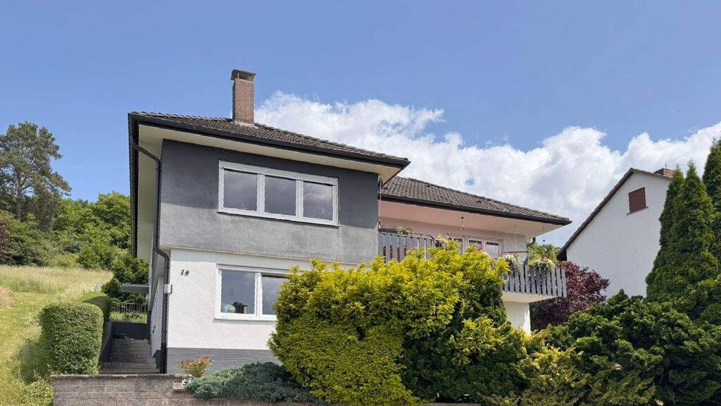 Sehr sonnig und beste Südhanglage mit tollem Ausblick vom Balkon über die Stadt, rückseitig unverbauter Blick in grüne Waldrandlage. Das Haus wurde in Jahr 2020 saniert mit Erneuerung der Elektrik, der Bäder, Bodenbeläge und Malerarbeiten, Rollläden. Die Fenster sind aus den Jahren 2002, 2004, 2009 und 2022. Die oberste Geschoßdecke wird noch gedämmt (Auftrag erteilt). Das Haus kann als großzügiges Einfamilienhaus über zwei Etagen genutzt werden oder das untere Geschoss eventuell als Einliegerwohnung mit separatem zweiten Eingang von außen. Aufteilung: Wohnetage 5 Zimmer mit Balkon ca. 108 qm als Vollgeschoß (ohne Dachschrägen) mit großzügiger Raumaufteilung: Wohnzimmer, Esszimmer und 1 Schlafzimmer haben Zugang zum großen teilüberdachten Südbalkon mit tollem Ausblick über die Stadt. Große Wohnküche, Abstellraum, 2 kleinere (Kinder-)Zimmer, neues Tageslichtbad mit Badewanne und Dusche, Tageslicht-Gäste-WC. Untere Etage / eventuell Einliegerwohnung mit Terrasse und separatem Zugang ca. 64 qm: 3 (Schlaf-) Zimmer oder alternativ 1 Küche (Anschlüsse vorhanden), neues Tageslichtbad mit Dusche, Terrasse. Über separaten Flur: Waschraum mit Zugang zum Garten, Heizungs- und Abstellraum. Großer Dachboden mit Stehhöhe (ggf. Ausbaureserve), 1 Garage mit Lagerboden. Garten mit teilweise begradigte Rasenfläche, hinterer Grundstücksteil in Hanglage, zweite Terrasse hinter dem Haus. Das Haus ist derzeit befristet vermietet. Der Mietvertrag verlängert sich jeweils um 1 Jahr, wenn nicht gekündigt wird.