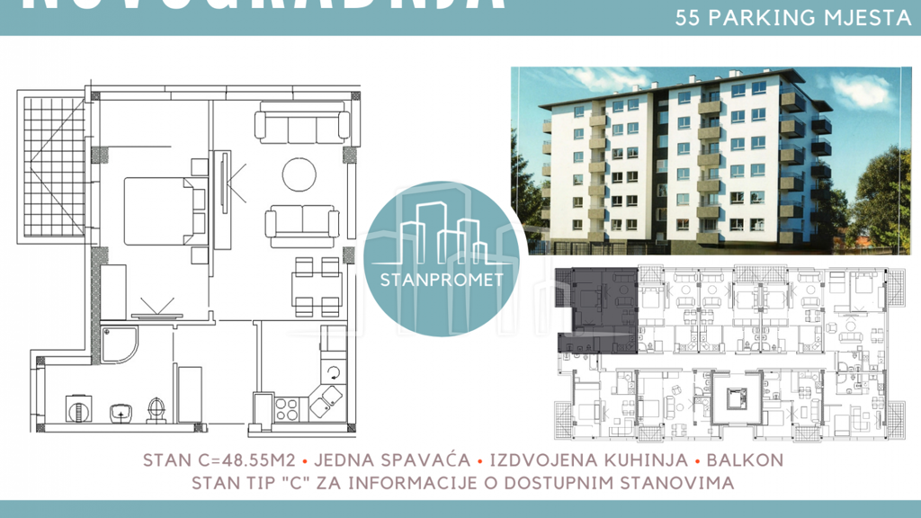 Die Immobilienagentur Stanpromet.ba Banja Luka kündigt den Verkauf von Wohnungen in ausgezeichneter Lage in Kotor Varos, Ulica Stefana Nemanja und Knez Mihajlova an. Das Gebäude, in dem sich diese hochwertigen Wohnungen befinden, Erdgeschoss (8 Garagen und Geschäftsräume) + 6 Etagen, ein Gebäude mit Aufzug und zentralem Treppenhaus, der Zugang zu jeder Etage ist durch separate Einbruch- und Brandschutztüren gesichert, jede Etage verfügt über 9 Wohneinheiten, d.h. insgesamt 55 Wohnungen, ausgelegt als Ein- und Zweizimmerwohnungen, Einzimmerwohnungen von 33m2 bis 48,55m2 und Zweizimmerwohnungen von 54,40m2 auf den Geschossen vom 1. bis zum 6. Obergeschoss. Für aktuelle Informationen zu verfügbaren Wohnungen/Etagen kontaktieren Sie uns bitte. Im Erdgeschoss befinden sich gestaltete Garagen und Geschäftsräume, acht Garagen und 55 Stellplätze vor und um das Gebäude. Bei der angebotenen Wohnung handelt es sich um eine komfortable Zweizimmerwohnung C 48,55 m2 mit doppelter Ausrichtung, bestehend aus einer Eingangshalle, einem Wohnzimmer mit Küche und Esszimmer, einem Schlafzimmer, einem Badezimmer und einem Balkon. Die hervorragende Qualität der beim Bau der Anlage verwendeten Bauelemente sowie der endgültigen Bodenbeläge, Sanitärkeramik, Außen- und Innenschreinereiarbeiten mit Wärmedämmung gewährleisten allen Käufern von Wohnungen in der Anlage eine gute Lage mit Straßenanbindung und Verfügbarkeit aller Einrichtungen, die für ein angenehmes Leben notwendig sind, niedrige Kosten für regelmäßige und laufende Wartung . Hervorragende Energieeffizienz zum Kühlen und Heizen des Raums mit hervorragender Schalldämmung, die einen angenehmen Aufenthalt und eine angenehme Nutzung bei minimalen Nebenkosten für alle Kunden garantiert. Auf den Böden wird Parkett verlegt, in Bad und Küche hochwertige Fliesen, die Eingangstür ist gepanzert und feuerfest und einbruchhemmend. Es ist möglich, eine Garage mit der Wohnung zu kaufen Nutzen Sie die Gelegenheit und kaufen Sie eine Wohnung während des Aktionsangebots ab 1581 KM pro m2 zzgl. MwSt. 1850 km pro m2. Für alle zusätzlichen Informationen über Quadratmeterzahl, Verfügbarkeit, Stockwerke oder Zahlungsmethoden sowie für die Vereinbarung einer Besichtigung oder Besichtigung der Wohnungen, des Gebäudes, rufen Sie Ihren Makler Stanpromet.ba - Immobilienagentur Makler Zelimir an