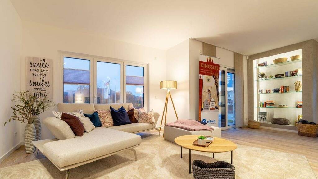 Erleben Sie die faszinierende Helligkeit dieser eindrucksvollen Räumlichkeiten, wo Küche, Wohn- und Esszimmer harmonisch ineinander übergehen. Stellen Sie sich vor, wie Sie entspannte Sonnenstunden auf der Terrasse genießen, die durch zahlreiche bodentiefe Fenstertüren von mehreren Räumen aus erreichbar ist. Ein kleiner Erker, der durch die vorgezogene Wand des Esszimmers entsteht, bietet eine charmante Abschirmung des Außenbereichs. Im Obergeschoss erwarten Sie drei einladende Schlafzimmer und ein luxuriöses Tageslichtbad, welches Ihnen reichlich Platz bietet, um sich zurückzuziehen und zu entspannen - es bleiben hier keine Wünsche offen.