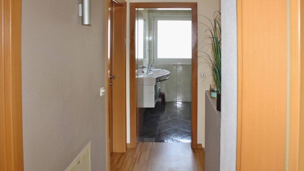 Obergeschoss: drei Zimmer, Badezimmer mit Fenster, Badewanne, Dusche und WC; Balkon von zwei Zimmern aus begehbar