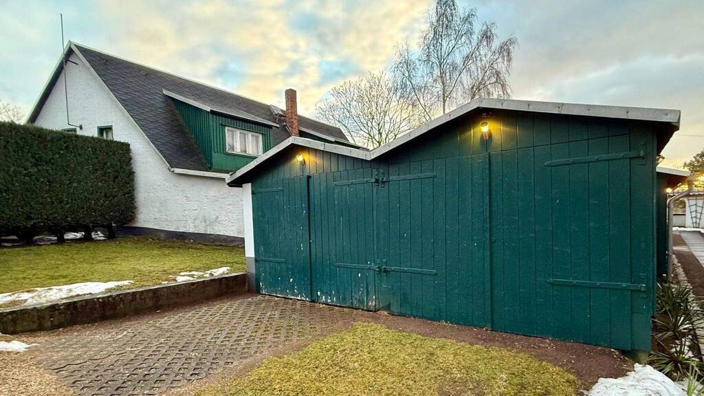Darüber hinaus steht auf dem Grundstück ein weiteres Einfamilienhaus aus dem Jahr 1950, das zu etwa 70 Prozent unterkellert ist. Dieses Wohnhaus bietet rund 100 m² Wohnfläche und wird über eine Gasheizung mit eigenem Gastank beheizt. Es ist sanierungsbedürftig, verfügt jedoch bereits über modernisierte Bauteile: So wurde das Dach im Jahr 2012 neu eingedeckt, die Fenster wurden 1999 ausgetauscht und das Dach ist bereits gedämmt. Ergänzt wird das Ensemble durch eine Doppelgarage, einen großen Schuppen sowie weitere Unterstellmöglichkeiten.