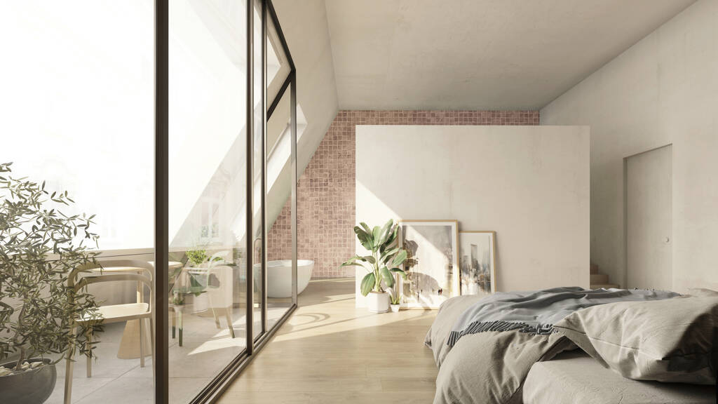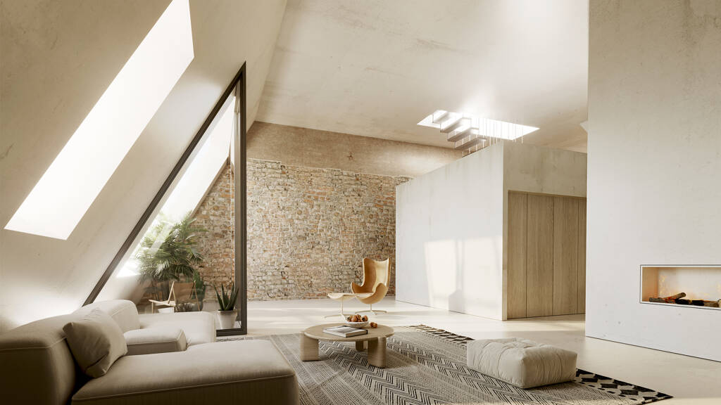 Der Neuaufbau des Dachgeschosses ermöglicht atemberaubende Raumhöhen von ca. 4m und ein kontemporäres Licht- und Materialkonzept für ein einzigartiges Wohngefühl.