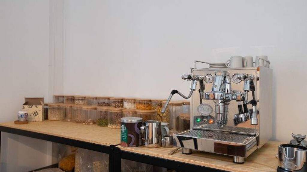 Esszimmer mit einer Siebträger-Kaffeemaschine und einer Müsli-Bar