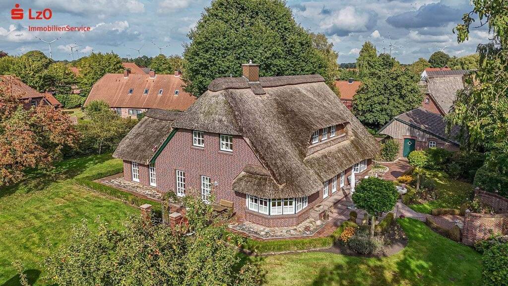 Im Jahre 2000 wurde dieses traumhafte Reetdachhaus errichtet. Es wurde nicht nur massiv, sondern auch mit hochwertigen Baumaterialien erbaut und strahlt durch seine moderne Architektur, dem klassischen Reetdach und seinen vielen Möglichkeiten einen ganz besonderen Wohncharakter aus. Die großzügige Wohnfläche von fast 250 m² und das sehr schön eingewachsene Grundstück mit altem Baumbestand und 1.964 m² ermöglichen viele Nutzungen und Entfaltungsräume. Das Grundstück wirkt durch die angrenzenden Wiesen im Westen nicht nur viel größer, sondern erweckt einen parkähnlichen Charme durch die weitläufigen Sichtachsen über die Felder Richtung Sonnenuntergang. Ebenfalls vorhanden ist ein riesiges geschlossenes und massiv erbautes Doppelcarport, mit einem großen angrenzenden gedämmten und beheizten Raum, der als Waschküche oder HWR nutzbar ist. In den Garagen lässt sich ohne weiteres eine Werkstatt integrieren.