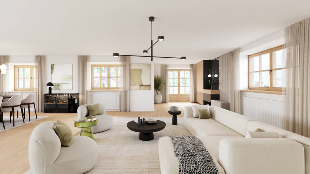 Als moderne Variante sehen Sie in der Bildergalerie das Wohn- und Esszimmer neu gestaltet. Diese zwei Varianten sind nur Visualisierungen und als Gestaltungsidee beigefügt.