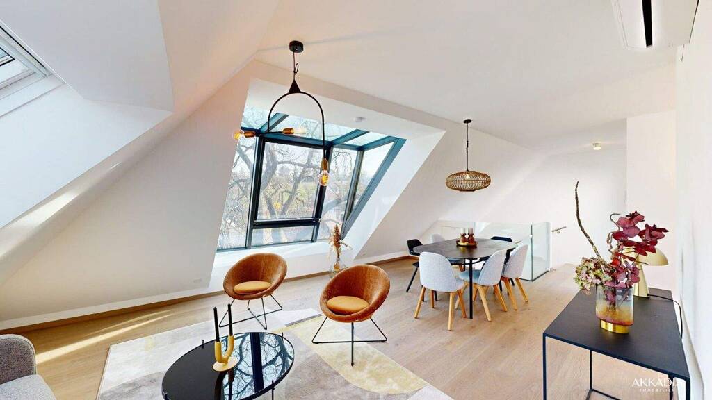 Den Mittelpunkt der Wohnung bildet der großzügige Wohnbereich im Obergeschoss. Der offen gestaltete Wohn-/Ess-/Kochbereich mit ca. 43,29 m² überzeugt durch seine Weitläufigkeit und sorgt durch großzügige Fensterflächen für eine helle und freundliche Wohnatmosphäre. Die architektonisch markante Panoramagaupe mit großflächiger Verglasungprägt den Raum und schafft ein besonderes Wohngefühl im Dachgeschoss.