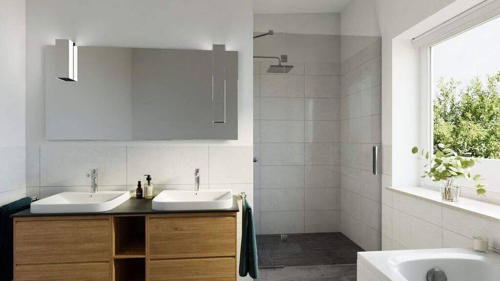 Das modern gestaltete Tageslichtbad beeindruckt mit einer ebenerdigen Walk-In Dusche, einer Badewanne, einem Waschmaschinenanschluss sowie einem Abluftventilator fĂĽr ein angenehmes Raumklima.