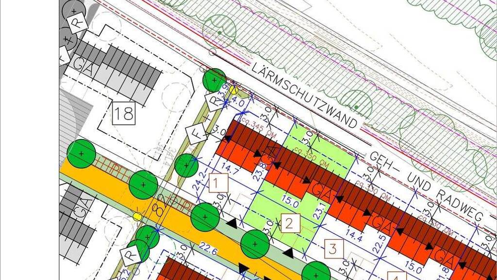 - Bei der Anordnung der besonders schutzbedürftigen Räume, (Schlafen, Wohnen Essen) die besonderen Vorgaben im Bebauungsplan zu beachten. Diese Räume sind an der von der Straße abgewandten Seite zu planen. Dies betrifft vor Allem die Parzellen 1-15.