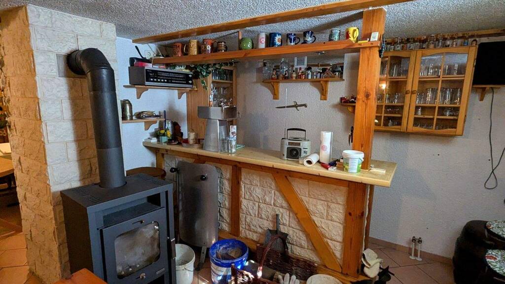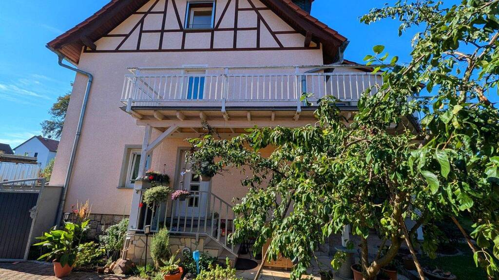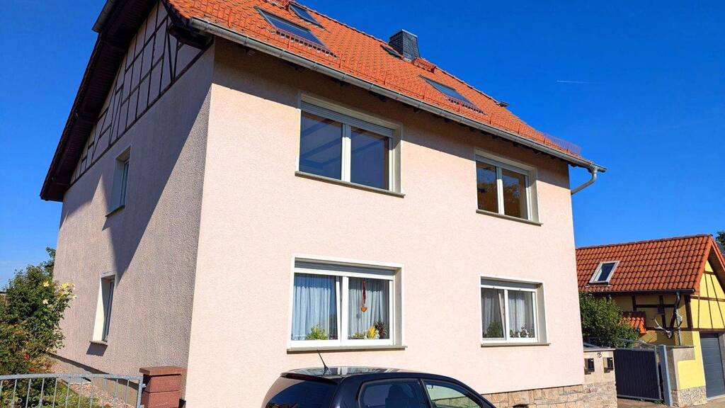 Das freistehende Zweifamilienhaus verfügt über insgesamt ca. 196 m² Wohnfläche auf 3 Etagen zzgl. ca. 10 m² Nutzfläche im Spitzboden. Das um 1936 massiv teilweise mit Fachwerk gebaute und unterkellerte Haus kann aufgrund der guten Aufteilung und dem Treppenhaus, wodurch die Einheiten separat erreicht werden können, sehr gut als Zweifamilienhaus oder als Einfamilienhaus mit getrennter Büroeinheit genutzt werden. Es kann nach Ablauf des Wohnrechts sowohl komplett eigengenutzt oder teil- bis vollvermietet werden. Derzeit steht das Wohnhaus, welches auf einem 499 m² großen Grundstück steht, zum Teil leer. Die Erdgeschosswohnung mit etwa 66 m² ist bewohnt; die Bewohner (eine Frau ca. 76 Jahre und ihr Bruder ca. 72 Jahre alt) verfügen über ein grundbuchgesichertes Wohnrecht; daher wird Eigenkapital in Höhe von mindestens 70.000,- € benötigt. Diese Wohnung verfügt über einen Flur, 4 kleinere Zimmer, eine Küche und einem Badezimmer mit Dusche und Tageslicht. Die 2006 / 2007 sanierte Maisonette-Wohnung im 1. Obergeschoss und Dachgeschoss mit ca. 130 m² Wohnfläche beinhaltet einen großen Eingangsbereich im Erdgeschoss, mehrere Flure, 6 Zimmer, eine kleine Essküche samt Einbauküche und Zugang zum Balkon, ein Waschraum, ein kleines Tageslichtbad mit ebenerdiger Dusche und ein Hauptbadezimmer im Dachgeschoss mit Badewanne und Dusche sowie einem großen Fenster. Im Dachgeschoss gibt es eine Fläche, welche als offenes Büro in der Galerie genutzt werden kann. Im oberen Kinderzimmer kann der Spitzboden über eine Raumspartreppe erreicht werden. Die Wohneinheit ist separat begehbar und verfügt über einen Kamin. Außerdem wurden zwischen 2014 und 2016 die Badezimmer im EG und im 1. OG erneuert sowie die Treppe und der Eingang zur oberen Wohnung neu errichtetet. Das Haus hat an den meisten Fenstern elektrische Rollläden. Es gibt einen Kellerraum, welcher der oberen Wohnung zugeordnet ist und eine Außentreppe, welche in den Garten führt. Zudem gibt es einen Gemeinschaftskellerraum, welcher über einen großzügigen Partykeller samt Kamin sowie einer Bar verfügt. Das Gebäude mit Nebengebäude inklusive Garage (aufgeteilt auf die beiden Wohnungen), Innenhof und Garten samt Gartenterrasse (wird derzeit von den Bewohnern des Erdgeschosses benutzt) befinden sich in einem gepflegten Zustand. Das Haus liegt am Rand eines Feldes, dieses kann durch eine kleine Tür direkt begangen werden. Das Wohnhaus wird über eine Öl-Zentralheizung beheizt. Der Energiebedarfskennwert beträgt 139,3 kWh / (m² * a) und hat die Energieeffizienzklasse E.
