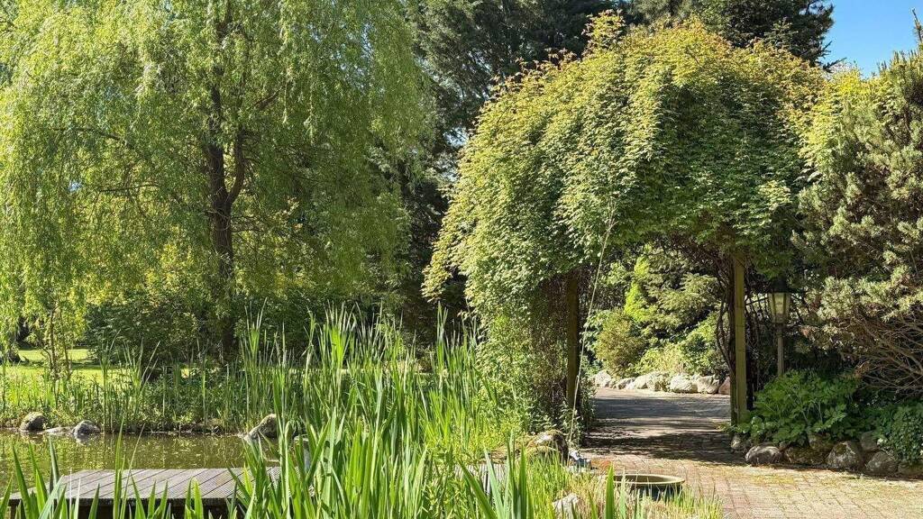 Das rund 13.000m² große, vollständig eingezäunte Grundstück wurde mit viel Liebe zum Detail zu einem parkähnlichen Garten mit Teichanlage, Gartenpavillon, befestigten Spazierwegen, altem Baumbestand und üppiger Bepflanzung gestaltet – blickgeschützt und in optimaler Süd-West-Ausrichtung.