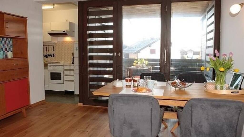 Der große Wohnraum beinhaltet eine kleine Küche, den Essbereich und das Ecksofa mit XXL-Fernseher. Über den Wohnraum gelangen Sie auf den großen überdachten Balkon, welcher ebenfalls vom Schlafzimmer betreten werden kann.