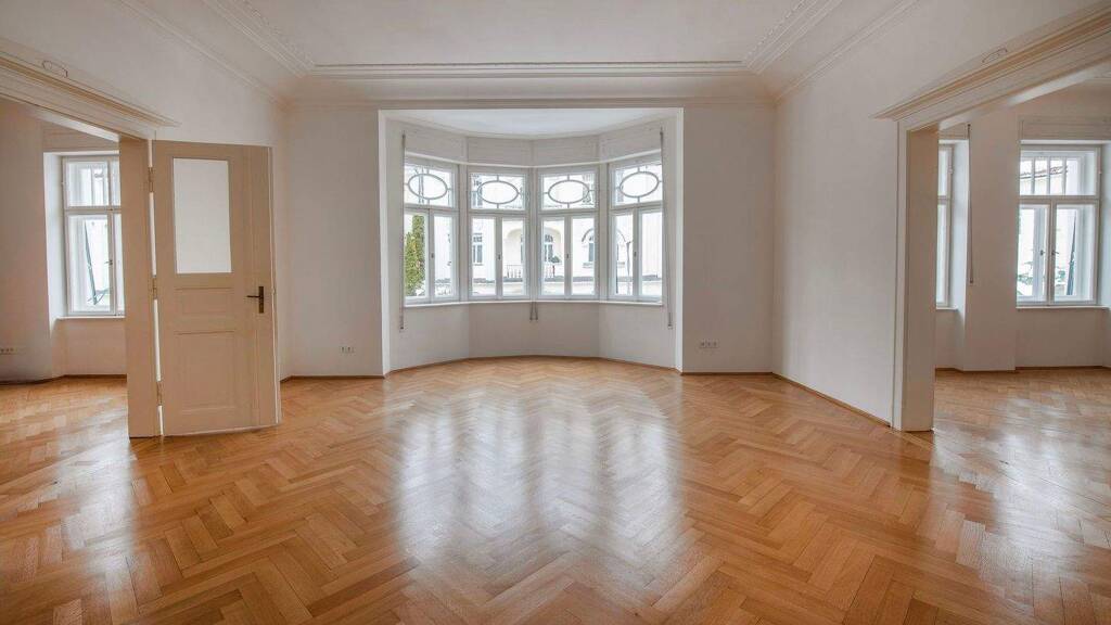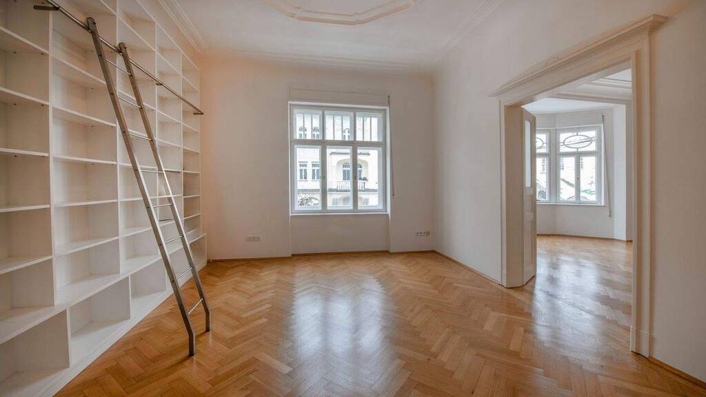 Sie verfügt über drei Schlafzimmer, eine Küche mit angeschlossener Abstellkammer, ein Esszimmer, ein Wohnzimmer mit charmantem Erker sowie eine Bibliothek. Die letztgenannten drei Zimmer sind durch klassische Flügeltüren miteinander verbunden und verleihen der Wohnung ihren unverwechselbaren Charakter.