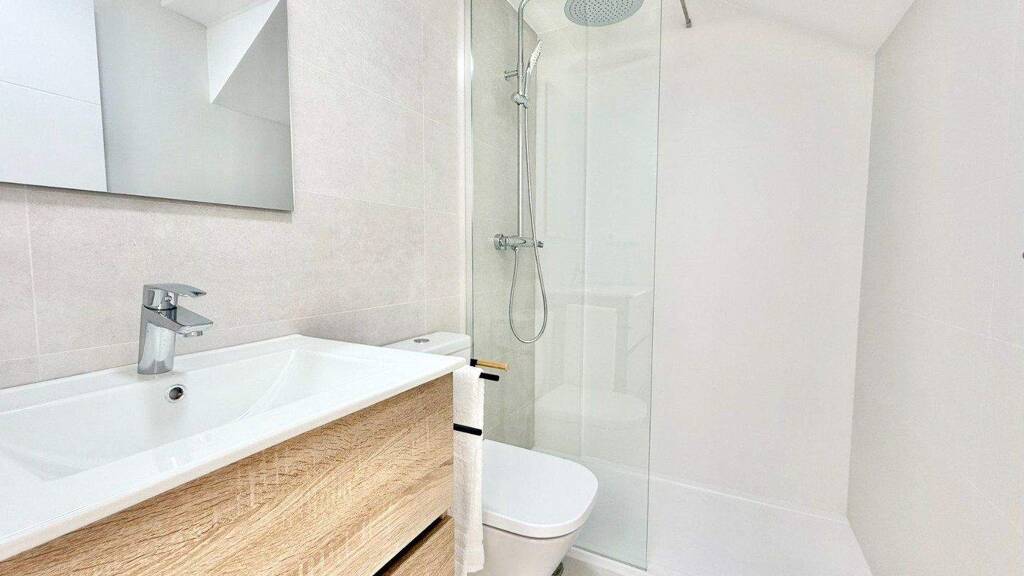 Die Innenräume bestechen durch schlichte Eleganz und hochwertige Materialien. Feinsteinzeugfliesen sorgen für ein stilvolles Ambiente und sind pflegeleicht. Elektrische Rollläden und die vorhandenen Haushaltsgeräte erleichtern den Alltag, und Einbauschränke gewährleisten eine optimale Nutzung des Stauraums. Dank der vorinstallierten Klimaanlage lässt sich das Raumklima individuell regulieren, sodass die Wohnung zu jeder Jahreszeit angenehm temperiert ist.