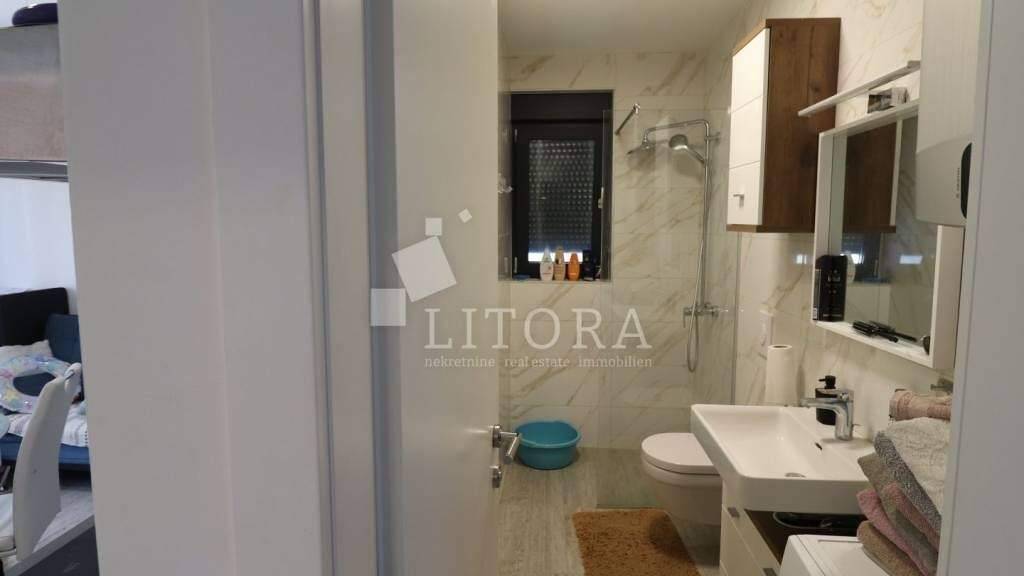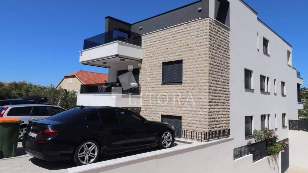Die Wohnung befindet sich im Erdgeschoss eines dreistöckigen Wohngebäudes und ist zur Südostseite ausgerichtet. Sie besteht aus zwei Schlafzimmern, einem Badezimmer, einer Küche mit Essbereich und einem Wohnzimmer mit Zugang zur Terrasse bzw. einem gepflasterten Hof von 27 m². Die Wohnung ist geschmackvoll eingerichtet und möbliert - die Möbel sind im Preis inbegriffen. Ausgestattet ist sie mit hochwertiger Keramik und Sanitäreinrichtungen, Sicherheitstüren, Klimaanlagen in allen Räumen, elektrischen Rollläden und Insektenschutzgittern. Zum Apartment gehören ein Kellerabteil und ein Parkplatz. Der Strand Slanica ist 280 Meter entfernt, das Ortszentrum 800 Meter.