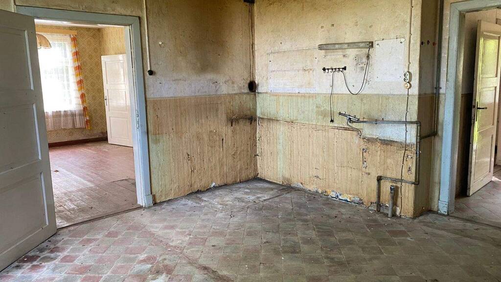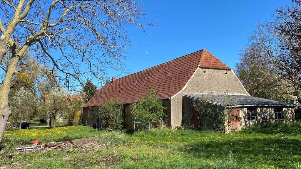 Das ca. 1928 gebaute Bauernhaus ist klassisch dreigeteilt in Wohnbereich, Stall und Scheune. Das Grundstück und das Gebäude wurden aufwändig beräumt. Der Zustand des Objektes ist sanierungsbedürftig und lässt damit sehr viel Raum für neue Ideen. Auf 3.546 m² gibt es Platz für eine individuelle Gestaltung, Ruhe und Phantasie in dem großen um das Gebäude liegenden Garten sowie dem soliden alten Obstbaumbestand. Derzeit besteht der Wohnbereich im Erdgeschoss aus drei Wohn- bzw. Schlafzimmern, sowie einer Küche. Alle Räume sind miteinander verbunden. Eine an die Küche angrenzende Kammer bietet Stauraum. Das Bad sowie das separate WC müssen ebenfalls vollständig erneuert werden. Das Obergeschoss ist ausbaufähig.
