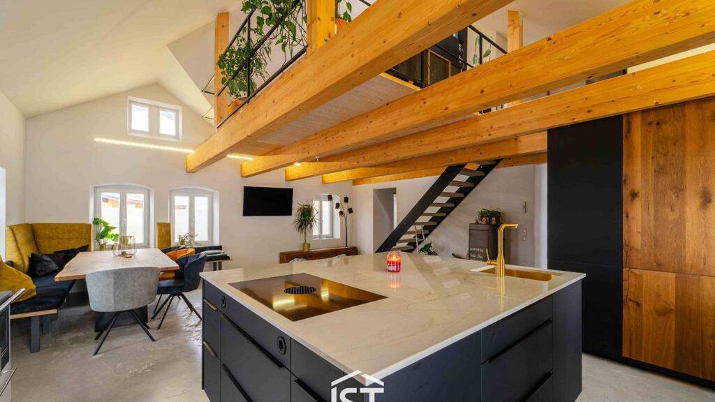 Die zweite Wohneinheit erstreckt sich über das Ober- und Dachgeschoss und bietet rund 100 m² Wohnnutzfläche. Ein großzügiger Wohnbereich mit moderner Küche samt Kücheninsel stellen zweifelsfrei den Mittelpunkt des Geschehens und das Herzstück der Wohnung dar. Von hier aus ist auch der Zugang zur Terrasse möglich.