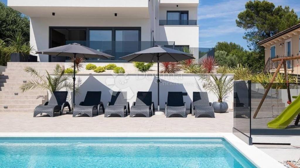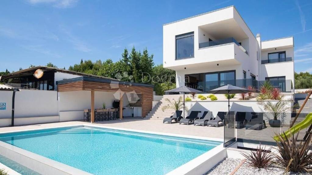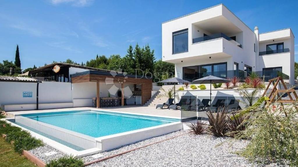 Eine luxuriöse Villa mit 195 m in ruhiger Lage, nur 200 Meter vom Strand entfernt. Dieses elegante Anwesen erstreckt sich über zwei Etagen und bietet einen wunderschönen Blick auf das Meer. Die Villa befindet sich auf einem großen Grundstück mit 766 m und verfügt über einen privaten Swimmingpool, einen Wellnessbereich und geräumige Terrassen. Das Erdgeschoss ist 97 m groß und besteht aus Flur, Toilette, Abstellraum, offenem Wohnzimmer, Küche und Esszimmer und durch große Glaswände bietet sich ein spektakulärer Blick auf das Meer. Das Erdgeschoss umfasst auch ein geräumiges Schlafzimmer mit 15,52 m, das über ein eigenes Badezimmer mit Dusche von 6,60 m verfügt. Dieses Zimmer bietet Meerblick und Zugang zu einer großen Terrasse. Vom Flur führt eine 3,25 m große Treppe in die erste Etage der Villa. Die erste Etage mit 97 m besteht aus einem Flur, einem privaten Bereich mit Wellnessbereich und Panoramaterrassen und 3 Schlafzimmern, jedes mit einem Badezimmer und einer Terrasse mit Aussicht. Das erste Schlafzimmer verfügt über einen begehbaren Kleiderschrank, und auf der Terrasse befindet sich ein Whirlpool. Der Garten besteht aus einem Swimmingpool (8 x 6 m), einer Sommerküche mit Grill, einem überdachten Bereich mit großem Tisch und einer Außendusche alles hervorragend ausgestattet und luxuriös dekoriert. Vor der Villa gibt es einen privaten Parkplatz für vier Fahrzeuge, und das gesamte Anwesen ist mit einer Alarmanlage und Überwachungskameras ausgestattet. Die Villa ist in allen Zimmern mit Klimaanlage ausgestattet, während alle Badezimmer über eine elektrische Fußbodenheizung verfügen. Der Außenbereich ist mit Außenbeleuchtung ausgestattet, die in den Abendstunden für zusätzliche Ästhetik und Sicherheit sorgt. Für weitere Informationen und eine Besichtigung kontaktieren Sie uns bitte. M: +385 91 732 5577