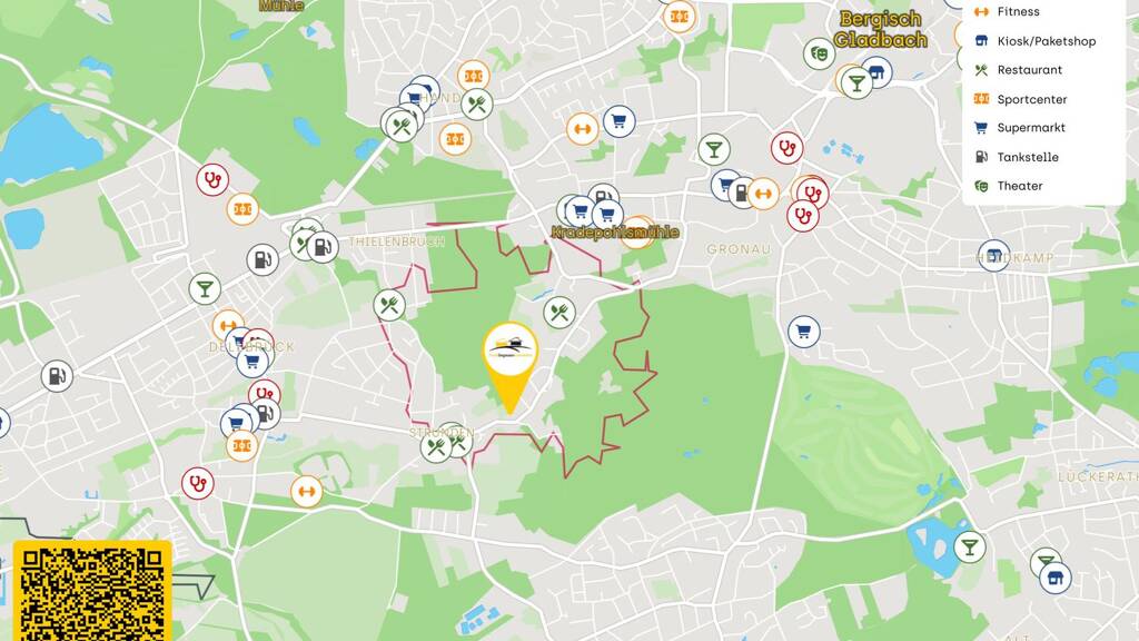 Die Immobilie befindet sich in einer ruhigen und dennoch gut angebundenen Lage in Bergisch Gladbach. In unmittelbarer Nähe finden sich zahlreiche Annehmlichkeiten, die den Alltag erleichtern. Einkaufsmöglichkeiten sind in Form von Supermärkten wie Lidl und ALDI Süd in ca. 1 km Entfernung bequem erreichbar. Für sportliche Aktivitäten stehen mehrere Sportstätten und Fitnessstudios in der Umgebung zur Verfügung, darunter die Tennishalle Gronau und das Fitnessstudio Yoga Sukha.