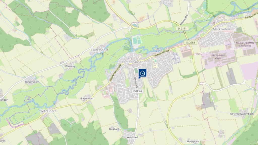Das Haus befindet sich im Markt Frontenhausen im Landkreis Dingolfing-Landau in Niederbayern und überzeugt durch seine ruhige sowie zugleich gut angebundene Lage. Vor Ort sind Einrichtungen des täglichen Bedarfs, Schulen und Kindergärten vorhanden. Die Umgebung zeichnet sich durch einen hohen Freizeit- und Erholungswert aus.