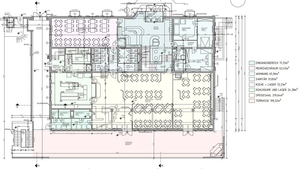 * heller und freundlicher großer Gästebereich für ca 118 Gäste * Mehrzweckraum/Veranstaltungsraum für ca 56 Gäste * große 200m2 Terrasse * Küche * 6 Kühlräume * Bar/Schankbereich * getrennte Toiletten